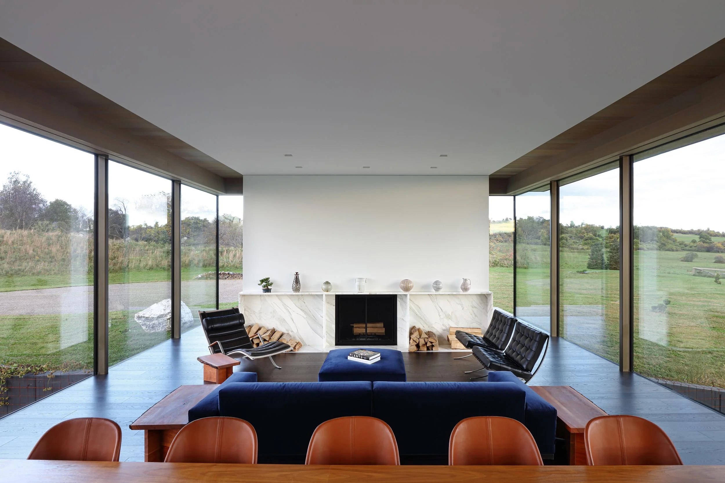 Set on a bucolic 220 acre farm in Dutchess County NY, this private home manifests the duality of living on this site: The desire for transparency and engagement with the landscape vs the desire for privacy. Rather than resolving this duality in a single object/condition, our solution for their home allows these conditions to exist in a tangential relationship. In this Venn diagram, there is no overlap. The public-facing areas of the house are contained within a glass volume that floats across the landscape.