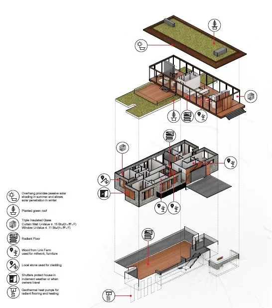 The building uses the site and the unique characteristics of the two volumes opportunistically maximizing the passive benefits of the two conditions as well as the active potential of the site for energy conservation. In terms of passive thermal strategies, the upper volume engages the exterior conditions and the lower volume insulates against the exterior environment. The triple insulated glass walls and roof overhang of the upper volume leverage summer and winter sun angles to shade the interior in summer and maximize solar penetration and heat gain in winter. The lower volume uses super-insulated walls and windows to create a thermal barrier. In addition, the stone flooring throughout this lower volume creates a thermal flywheel, stabilizing the temperature.